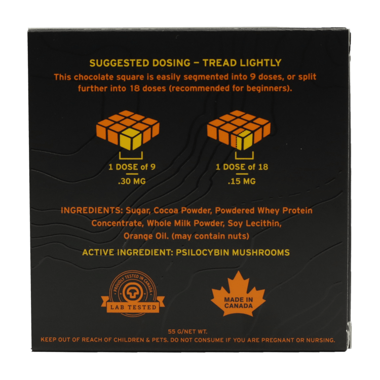 This chocolate square is easily segmented into 9 doses, or split further into 18 doses (recommended for beginners).