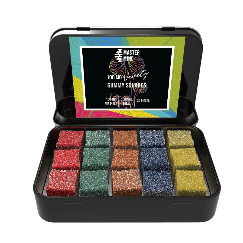 The Mastermind Gummy Squares contain 3000 mg of our premium blend of Psilocybe Cubensis Mushrooms. Each pack contains 5: Blue Raspberry, Cherry and Lime Flavoured gummies! The gummy squares are soured and bite sized making them great for microdosing, perfect for first timers, or casual day tripping.